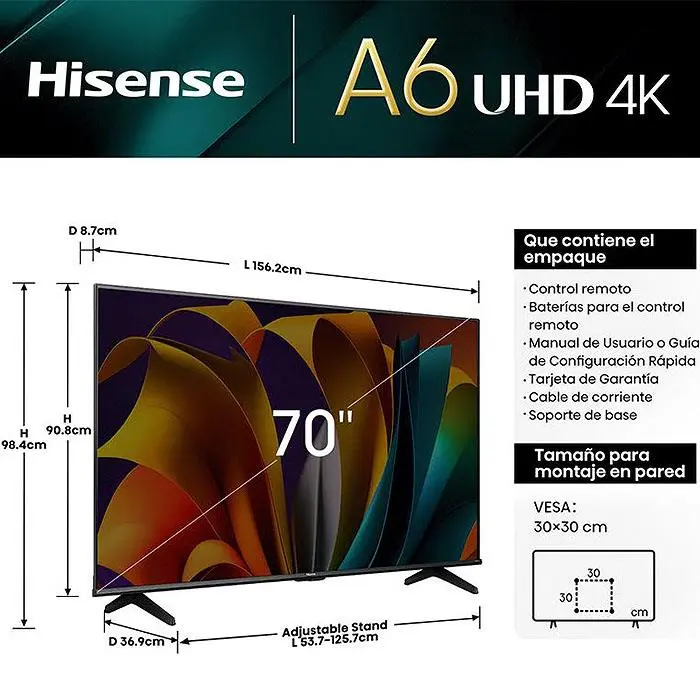 La Smart Tv Led 70 Pulgadas VIDAA Voice 4K UHD Negro Hisense ofrece una combinación de tamaño, calidad de imagen y funciones inteligentes que te permitira disfrutar de un entretenimiento superior en la comodidad de tu hogar. Cuenta con un sistema operativo inteligente que brinda acceso rápido y fácil a una amplia gama de aplicaciones, contenido en línea y servicios de transmisión.